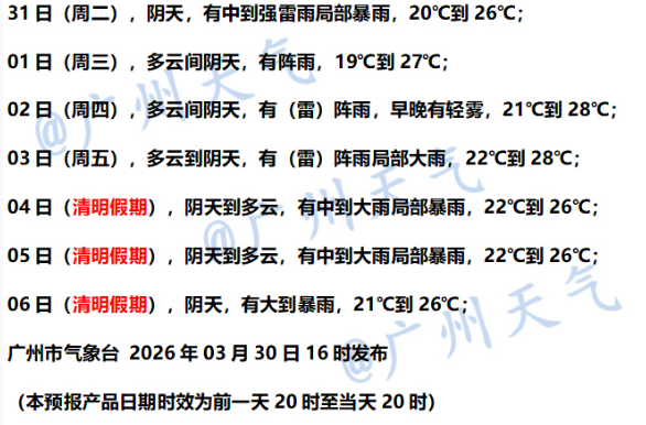 广州市景观台预测,3月31日,受高空槽、南风加强和切变线的影响,广州仍有中到强雷雨局部暴雨,并伴有短时大风(9~11级)、短时强降水(最大小时雨强20~40毫米)和局地冰雹等强对流天气。预测今天7-9时上班岑岭期,广州市区阴天,有小雨,气温21-24℃。请备好雨具,把稳交通安全。4月1日—2日降水消弱。